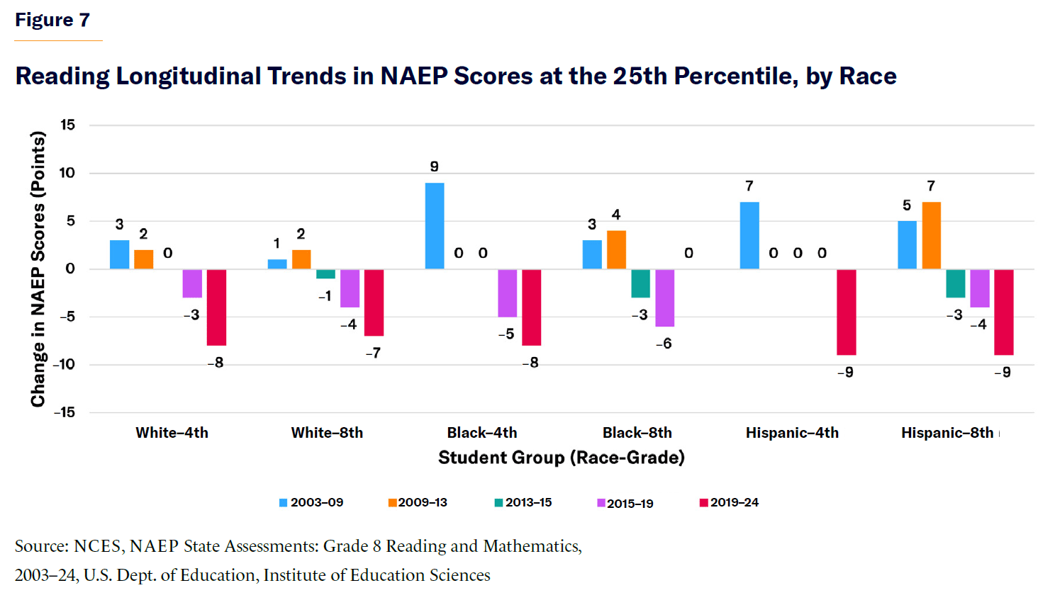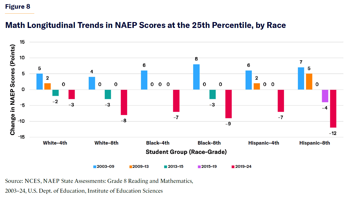 Progress stalled between 2009 and 2013, as the early implementation of Common Core led to instructional inconsistencies. Black students showed little to no growth in reading; and although Hispanic students saw small math gains, overall momentum faded. By 2013–15, early declines were emerging as Common Core was fully implemented. Eighth-grade reading proficiency began to drop across all racial groups, and math scores showed stagnation, signaling a weakening of prior academic progress.