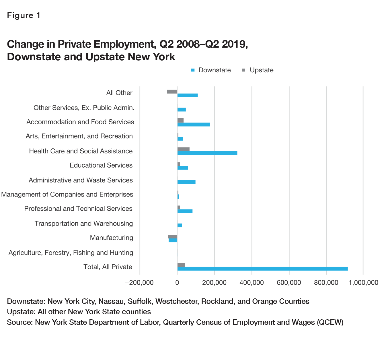 Figure 1 shows the change in average employment from the second quarter of 2008 to the second quarter of 2019 (second-quarter data are used to provide consistency in comparisons with the second quarter of 2021). In this period, which covers much of the recession that began in late 2007 and the subsequent recovery, private employment rose sharply in downstate New York but modestly upstate, by 41,000.[16]