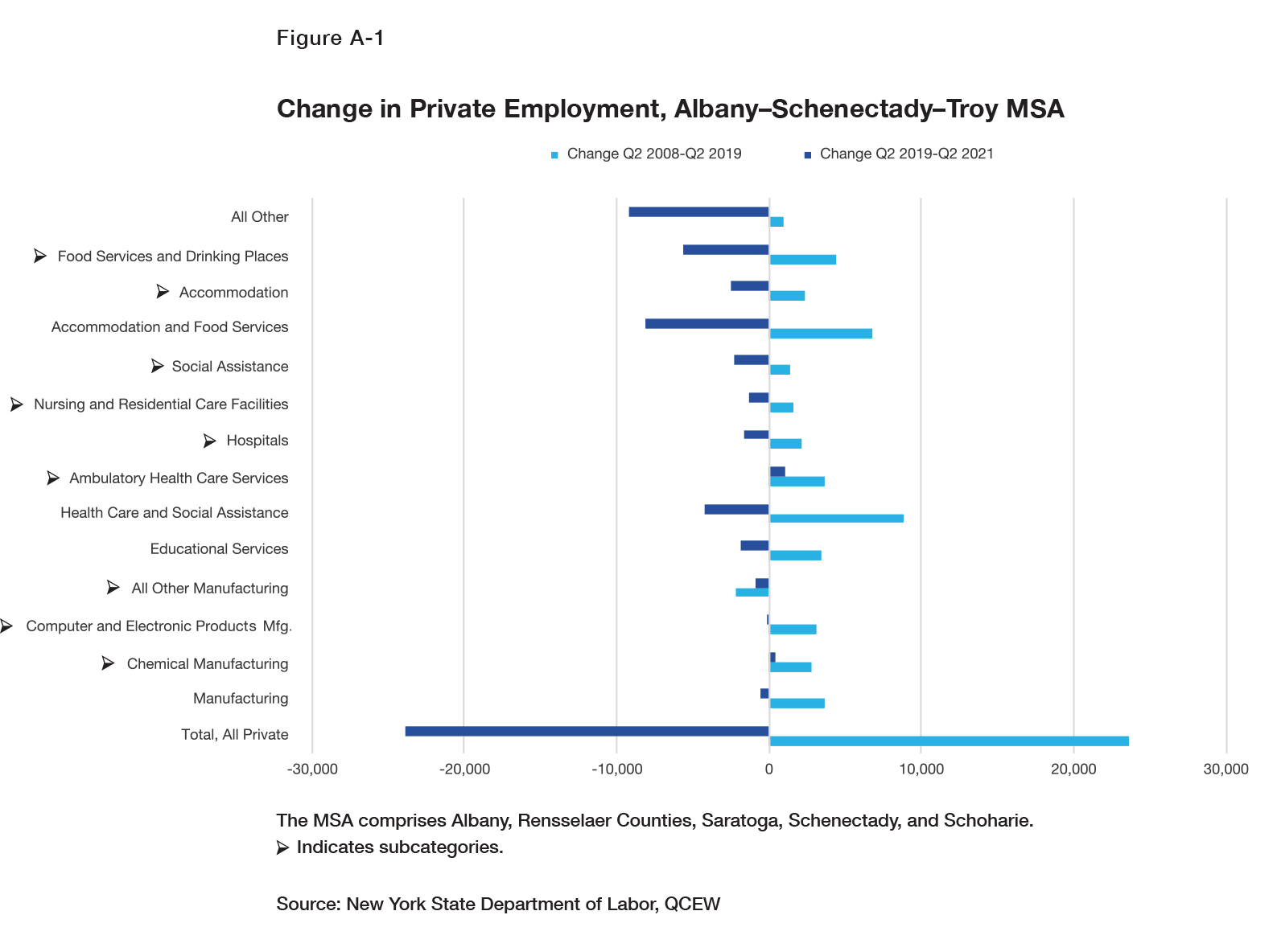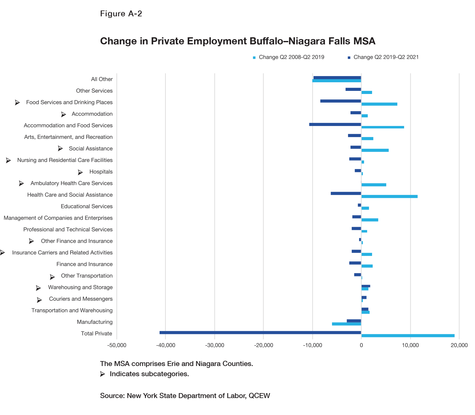 The Buffalo metropolitan area, comprising Erie and Niagara Counties, lost manufacturing jobs in both the Q2 2008–Q2 2019 and Q2 2019–Q2 2021 periods. However, it had more diversified gains in services in the initial period (Figure A-2). Between Q2 2008 and Q2 2019, the Buffalo area gained office-based jobs in such sectors as finance and insurance (mainly insurance), professional and technical services, and management of companies and enterprises. As in the Albany area, the largest gains in services were in health care and social assistance and accommodation and food services. The health care and social assistance gains of 11,500 jobs were mainly in ambulatory health care services and social assistance, which includes home care agencies, senior centers, and child day care. In accommodation and food services, most job gains were in food services and drinking places. Services jobs also increased in arts, entertainment, and recreation and other services, which includes repair, household employees, and nonprofit organizations.