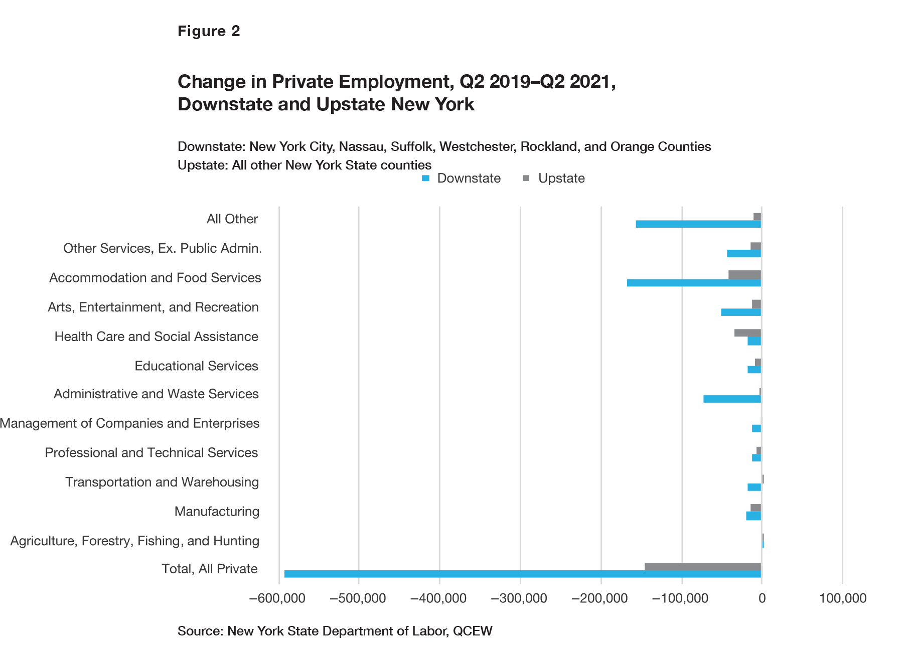 Between the second quarter of 2019 and the second quarter of 2021, employment growth turned sharply negative in downstate New York, as the region lost about 10.5% of its second-quarter 2019 private jobs (Figure 2). Upstate’s losses were less steep, at 5.9% of Q2 2019 private jobs. The largest job losses by sector upstate were in accommodation and food services, reflecting the contraction in tourism and restaurant meals, and in health care and social assistance.[18]