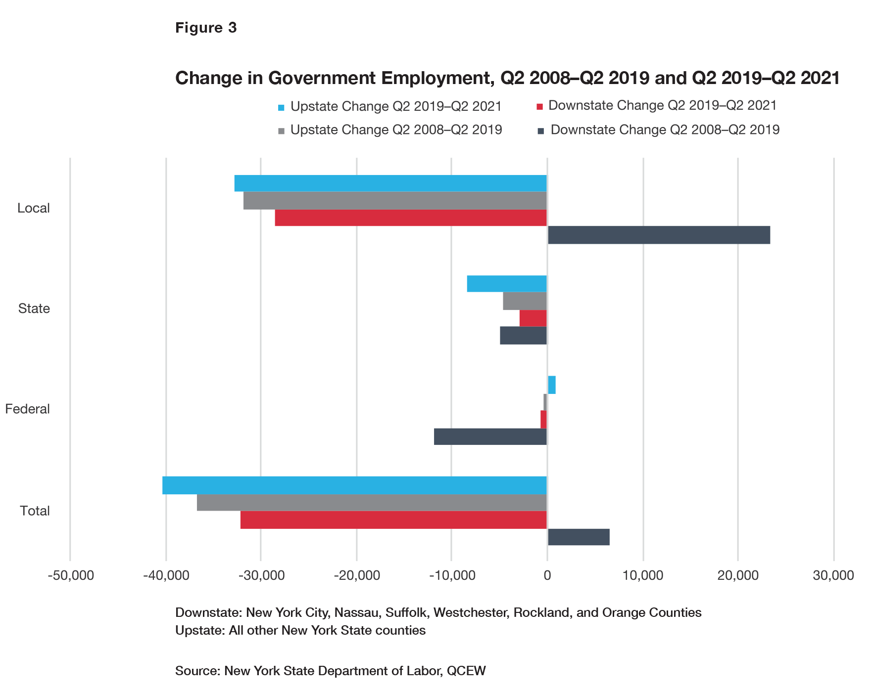 The increase in upstate private employment from Q2 2008 to Q2 2019 was offset by a fall in government employment (Figure 3). The biggest drop was in local government employment, which fell by 7.7%. In contrast, local government employment rose in the downstate area in the same period, entirely due to increases in New York City. From Q2 2019 to Q2 2021, local government employment fell both downstate and upstate.[19]