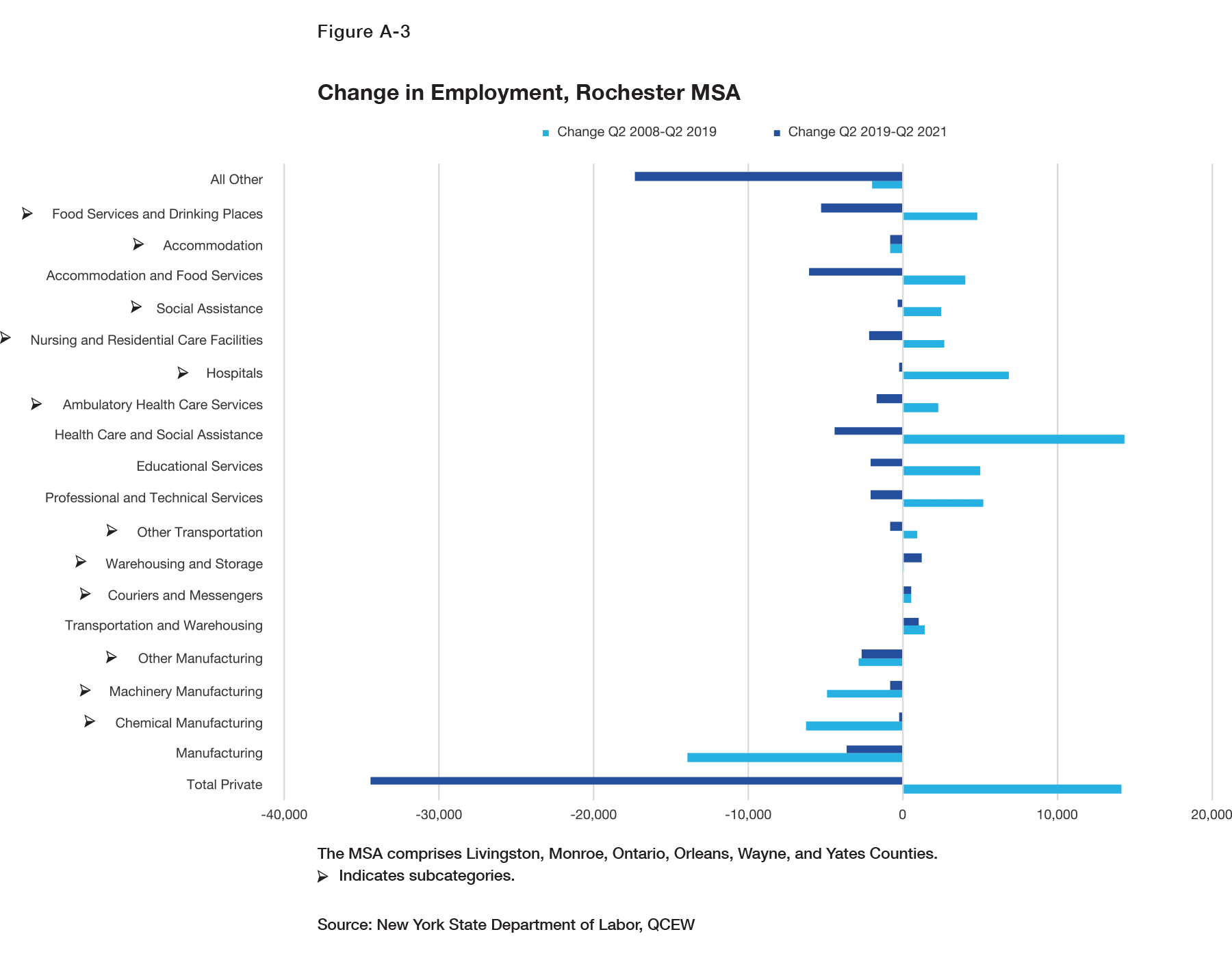 The Rochester area’s loss of manufacturing jobs was steep (–13,900) in the Q2 2008–Q2 2019 period, with the largest losses in chemical manufacturing and machinery manufacturing (Figure A-3). These losses continued after Q2 2019, during the pandemic.