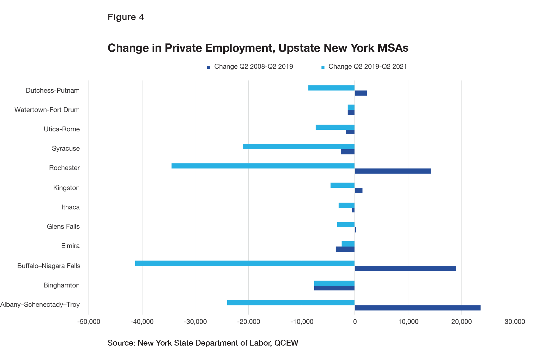 Most upstate employment is located in its 11 metropolitan statistical areas (MSAs) and in Dutchess and Putnam Counties.[20] As shown in Figure 4, only three of these areas (Albany– Schenectady–Troy, Buffalo–Niagara Falls, and Rochester) had significant private job growth between Q2 2008 and Q2 2019. The Albany area had the largest gain, just under 24,000, while the Buffalo area gained nearly 19,000 and the Rochester area about 14,000. Many other areas lost private jobs even in the growth phase of the business cycle. The situation was particularly grim in the Southern Tier, where the Binghamton MSA lost 8.7% of its private jobs and the Elmira MSA lost 11.2%. All the areas lost jobs during the post-2019 recession.