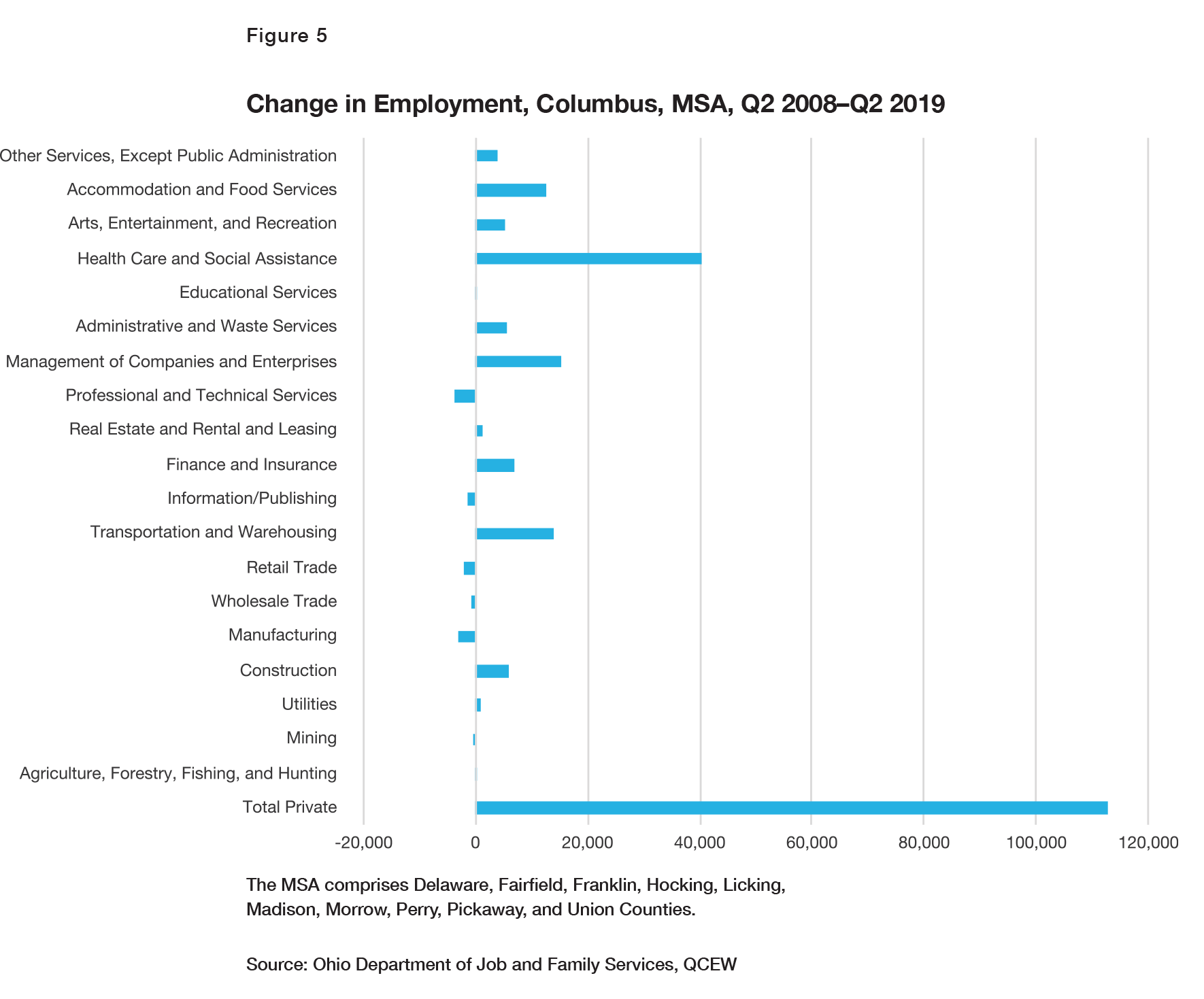 The MSA gained jobs overall between Q2 2008 and Q2 2019 mainly due to growth in professional and technical services (5,200), educational services (5,000), health care and social assistance (14,300), and accommodation and food services (4,000). The largest component of health care and social assistance growth was in hospitals (6,900), while in accommodation and food services, all of the growth was in food services and drinking places (4,800), offsetting losses in accommodation.