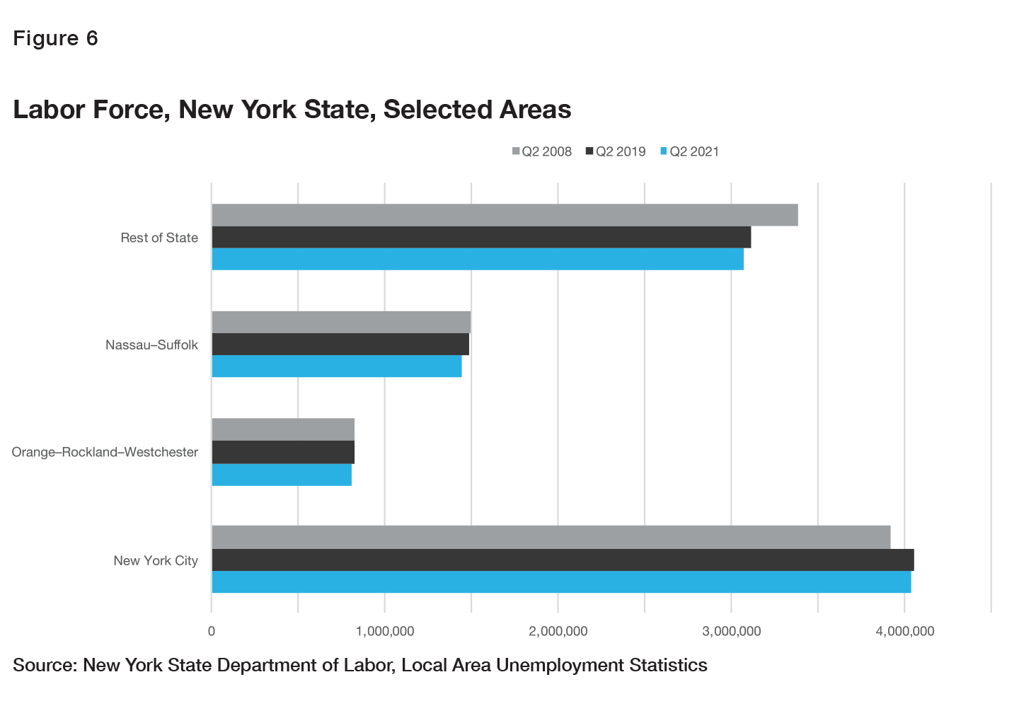 At a December 2019 briefing, before the pandemic-induced economic slowdown, Federal Reserve Bank of New York economists pointed to the decline in upstate New York’s labor force as a cause of its economic stagnation.[40] According to data from the New York State Department of Labor[41] (Figure 6), upstate’s labor force declined from 3.38 million in Q2 2008 to 3.115 million in Q2 2019, before the distorting effects of the pandemic, which reduced the labor force downstate as well.