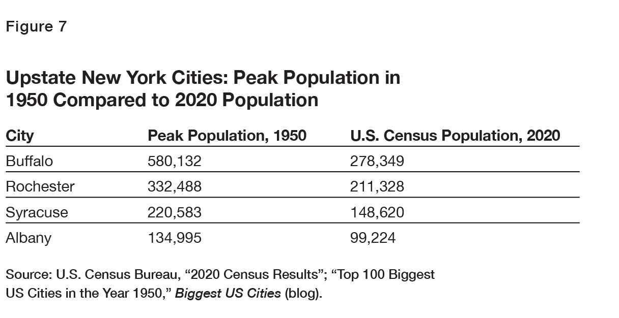 Upstate’s most notable legacy disadvantage is its growth pattern of multiple small cities, each greatly diminished in population from its peak. Compared with high-growth areas like Columbus, no city constitutes a labor market large enough to be attractive to many highly educated workers, who may be seeking a high level of urban amenities and job opportunities for equally qualified spouses. Upstate’s cities are distant enough from one another that crossing between labor markets is difficult. Upstate’s cities were once much larger, and have legacy institutions and infrastructure appropriate to their onetime size. Figure 7 shows the peak populations for major upstate cities.
