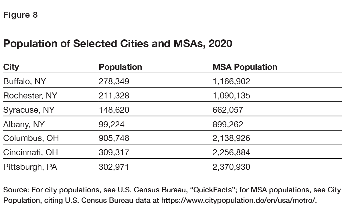 Competing postindustrial cities are larger. Columbus, Ohio, for example, had a 2020 U.S. census population of 905,748; Cincinnati, 309,317; and Pittsburgh, 302,971 (Figure 8). Their MSAs are much larger than those in upstate New York.