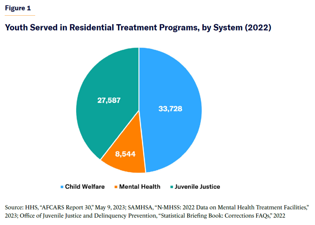 Accurately estimating the number of youth served annually in residential treatment is challenging. In 2022, three systems reported the following figures: 33,728 youth in child welfare, including group home and institutional settings;[11] 8,544 youth in mental health residential treatment centers;[12] and 27,587 youth in juvenile justice residential facilities.[13] However, these sources, illustrated in Figure 1, are not necessarily mutually exclusive, and overlap between systems is possible.