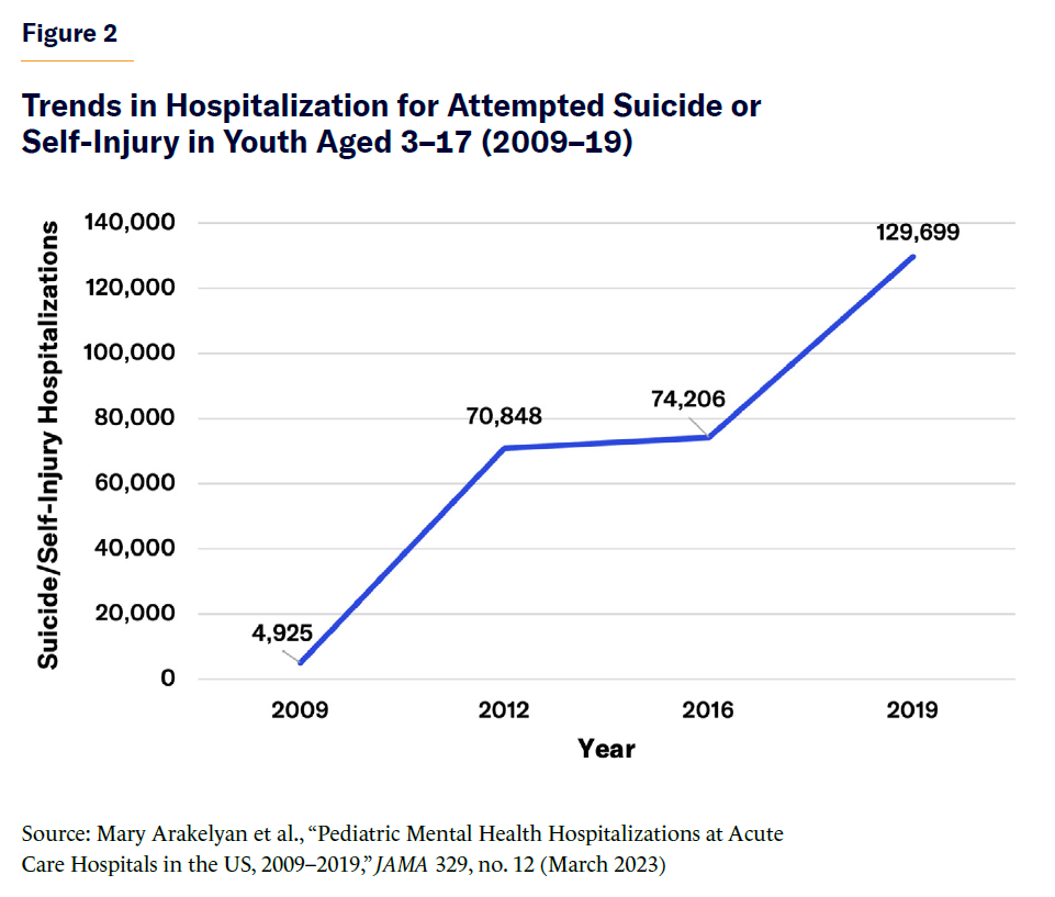 Figure 2 shows that during 2009–19, pediatric hospitalizations for attempted suicide or self-injury rose by 163.2%, underscoring the growing severity of youth mental health crises.[88]
