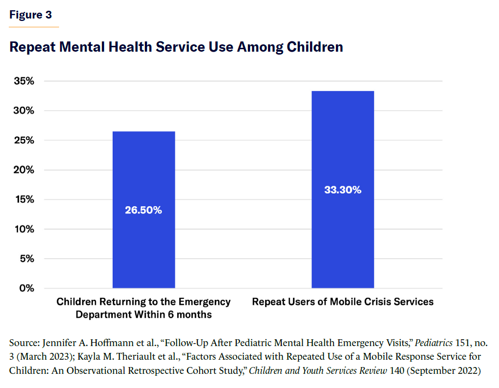 Additionally, 26.5% of children return to emergency departments within six months of their initial mental health–related visit, and one-third of children accessing mobile crisis services are repeat users (Figure 3).[89] Research finds that youth discharged from inpatient psychiatric hospitals to lower levels of care, such as day treatment, therapeutic foster care, or group homes, are significantly more likely to be readmitted to inpatient psychiatric hospitals, compared with those discharged to residential treatment programs, which provide a higher level of care.[90]
