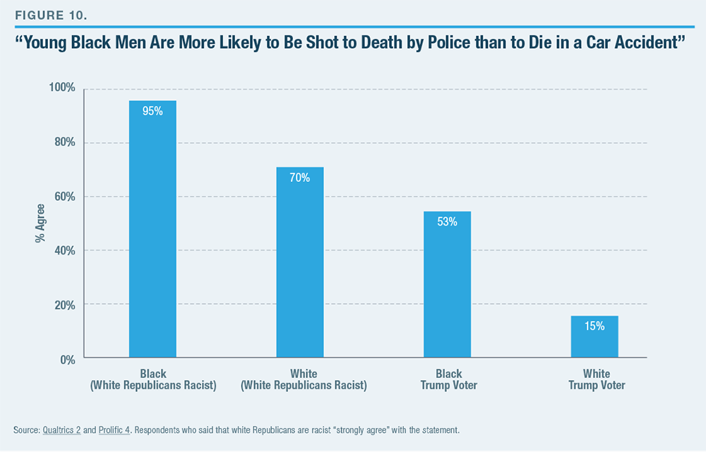It is, of course, possible that personal experiences of racism have shaped attitudes toward Republicans and shifted personal ideology and voting behavior. However, the fact that those who feel strongly that white Republicans are racist are considerably more likely to mistakenly believe that more young black men are shot to death by police than die in traffic accidents—and that answers to the personal experience questions reflect the same pattern—suggests that attitudinally motivated reasoning is the more plausible explanation.