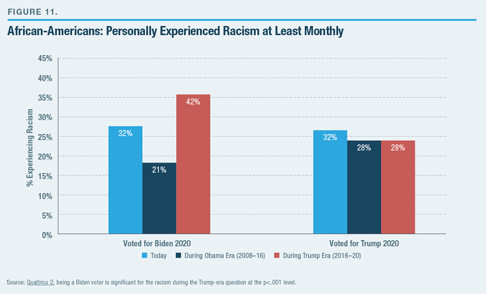 Much later in the 80-question Qualtrics 2 survey, I asked, “How often would you say that you experienced racism in your daily life during Barack Obama’s period in office, 2008–16?” I then asked the same question about experiencing racism “during Donald Trump’s period in office, from November 2016 until now.” Biden voters—the vast majority of the black sample— were twice as likely to say that they had experienced racism on at least a monthly basis (42%–21%) under Trump than under Obama (Figure 11).