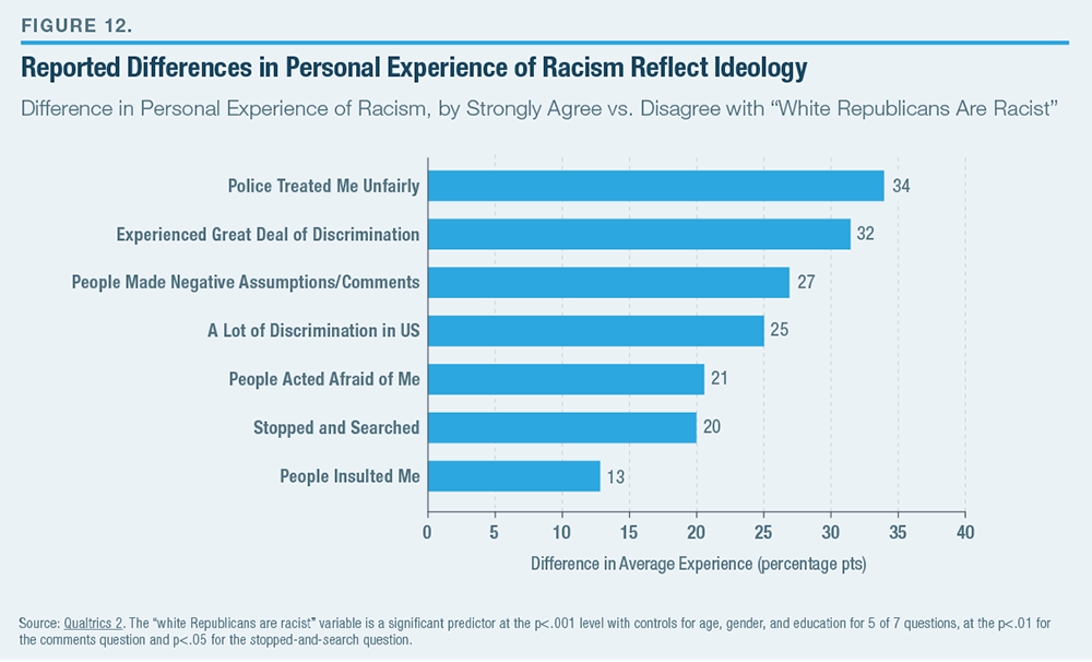 Previous research shows that partisans entertain wide misperceptions about the attitudes of the other party’s voters. Republicans overestimate Democrats’ hostility to the police, preference for open borders, and lack of patriotism by around 30 points. Democrats misperceive Republicans’ level of hostility to Muslims and immigration by a similar amount.[41] As with misperception about whether black men are more likely to be shot to death by police or killed in a traffic accident, reports of personal experiences of racism are heavily shaped by partisan perceptions of outgroup racial bias.