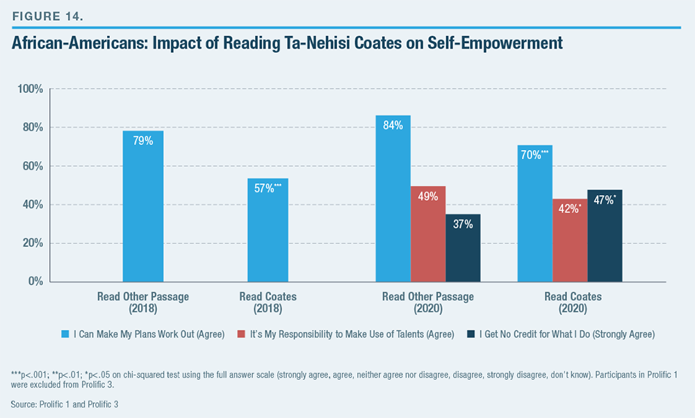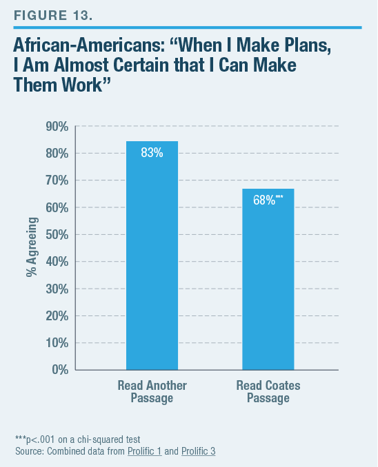 - Reading a passage from critical race theory author Ta-Nehisi Coates results in a significant 15-point drop in black respondents’ belief that they have control over their lives.