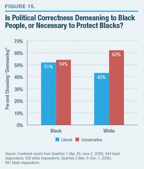 - A slight majority of African-Americans and whites overall felt that political correctness on race is demeaning to black people rather than necessary to protect them. Among blacks, the difference between liberals and conservatives was 3 points (51% of the liberals thought it was demeaning vs. 54% of the conservatives). Among whites, however, there was a nearly 20-point divide between liberals and conservatives (43% of the liberals thought it was demeaning vs. 62% of the conservatives).