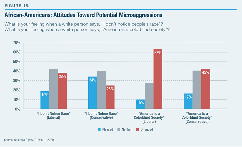 However, when they were asked, “What is your feeling when a white person says, ‘America is a colorblind society’?” a slim majority of black respondents (51%– 49%) said that they would be at least somewhat offended. Ideology figured in their responses. There was a 13-point gap between black liberals and conservatives (38%–25%) on the offensiveness of “I don’t notice people’s race” and a 21-point gap (63%–42%) on “America is a colorblind society” (Figure 16). Here, education level was as strong a predictor as ideology as to whether a black person would be offended. University graduates were 12–19 points more likely to be offended than those without degrees, comparable with the 13–21- point gap between liberals and conservatives. University-educated liberals were 26–27 points more likely than conservatives without a degree to feel offended by these statements. In addition to ideology, attending college appears to have a distinct effect in sensitizing black respondents to microaggressions.