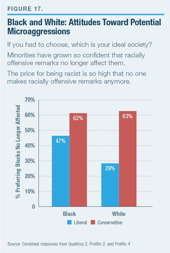 - When asked to choose between a future in which racially offensive remarks were so heavily punished as to be nonexistent and one where minorities were so confident that they no longer felt concerned about racial insults, black respondents overall preferred, by a 53%–47% margin, the resilience option. White liberals preferred the punitive option, by a 71%–29% margin; black liberals chose the second option by just 6 points, 53%–47%.
