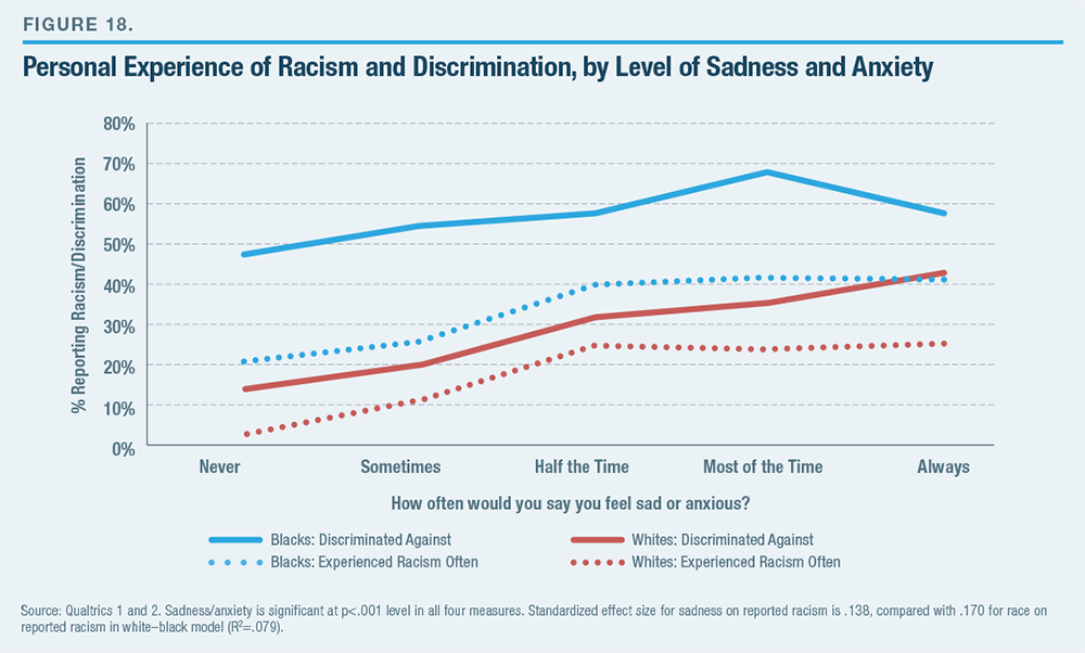 In order to tap respondents’ general level of depression and anxiety, I asked, “How often you would say that you feel sad or anxious?” in Qualtrics 1 and 2. Replies were provided on a scale from “never” through “always” sad or anxious. Those saying, “about half the time,” “most of the time,” or “always” made up 29% of the 1,028 white respondents and 26% of the 1,788 black respondents. These responses were then cross-tabulated with the agree/disagree responses to the statements “How often would you say that you experience racism in your daily life?” and “I have experienced a great deal of discrimination in my life.”