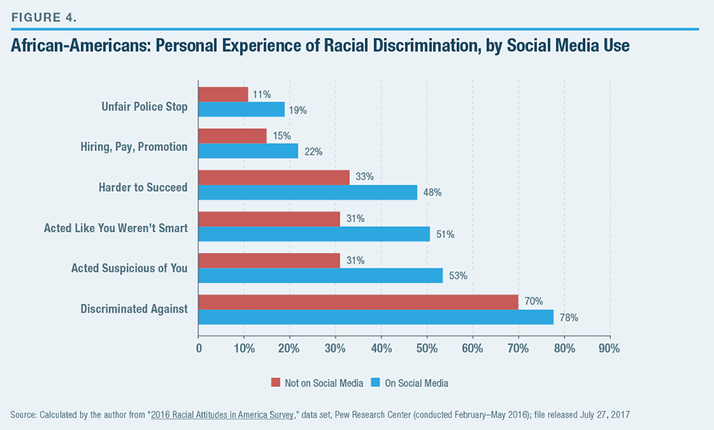 Evidence that social media may be shaping perceptions of racism is provided in Figure 4, which shows that black respondents on social media in 2016 were considerably more likely to report experiencing discrimination than those not on social media. This is a statistically significant effect that holds when controlling for age, education, income, partisanship, ideology, gender, and contact with whites. On questions about whether black people have experienced people acting suspicious of them or thinking that they are not smart, the gap between those on social media and those not on it reaches as high as 20 points.