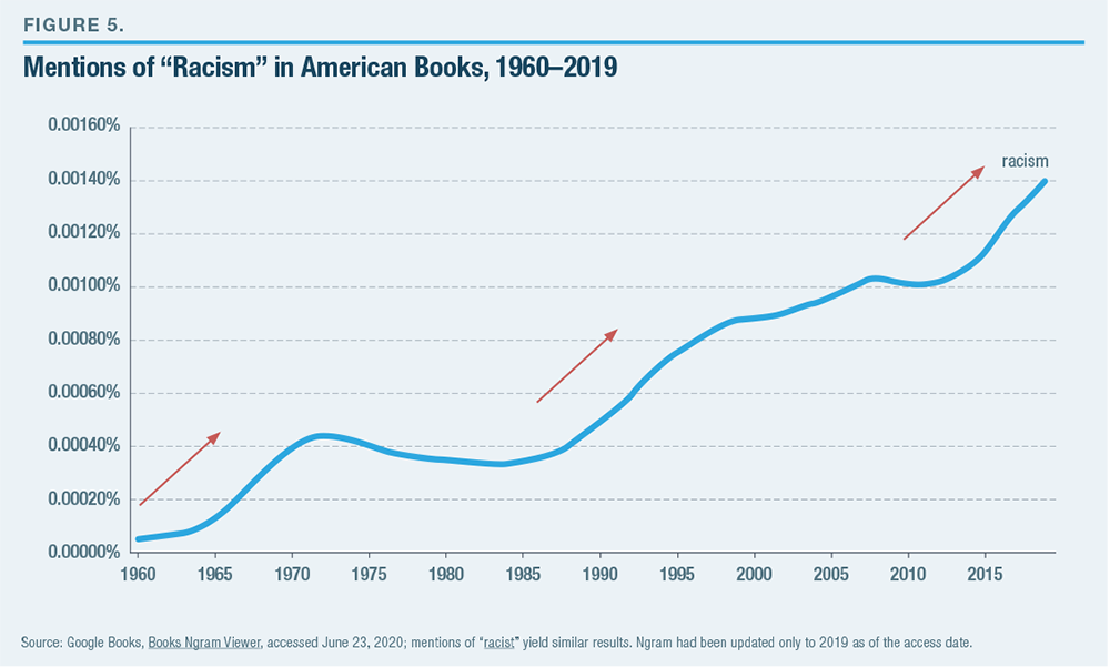 While the salience of racism fluctuates with events, the use of the term “racist” and “racism” has increased in three waves since 1960. Figure 5, based on big data from Google’s Ngram Viewer, tracks the popularity of terms in English-language books. It shows that the use of the term “racism” first rose sharply in the late 1960s, a time of New Left student activism. After reaching a plateau, it surged again and rose to a new level in the late 1980s and early 1990s, when political correctness and speech codes came into vogue. Then, around 2014, there was another upsurge, in tandem with the current period of left-modernist ferment. The use of terms such as racism (or racist/s) took off especially sharply in left-leaning media outlets such as Vox and the New York Times.[21]