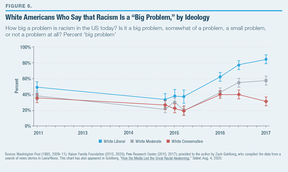 To what extent the most recent “Awokening” would have occurred in the absence of social media is an open question. Whatever the case, the Great Awokening has coincided with a large-scale shift to the left in attitudes toward questions of race, diversity, and immigration, especially among white liberals. Thus, partisanship and ideology increasingly affect perceptions of racism. The importance of ideological differences in perceptions of racism is shown in Figure 6, which reveals that among white conservatives, there has been little to no increase since 1995 in the share who think that racism is a “big problem.” White liberals show the greatest increase, with white moderates in between. The post-2014 trend (see Figure 2) of perceiving worse relations between whites and blacks is, therefore, less a reflection of statistical reality than of rising consciousness of racism, notably among liberals.