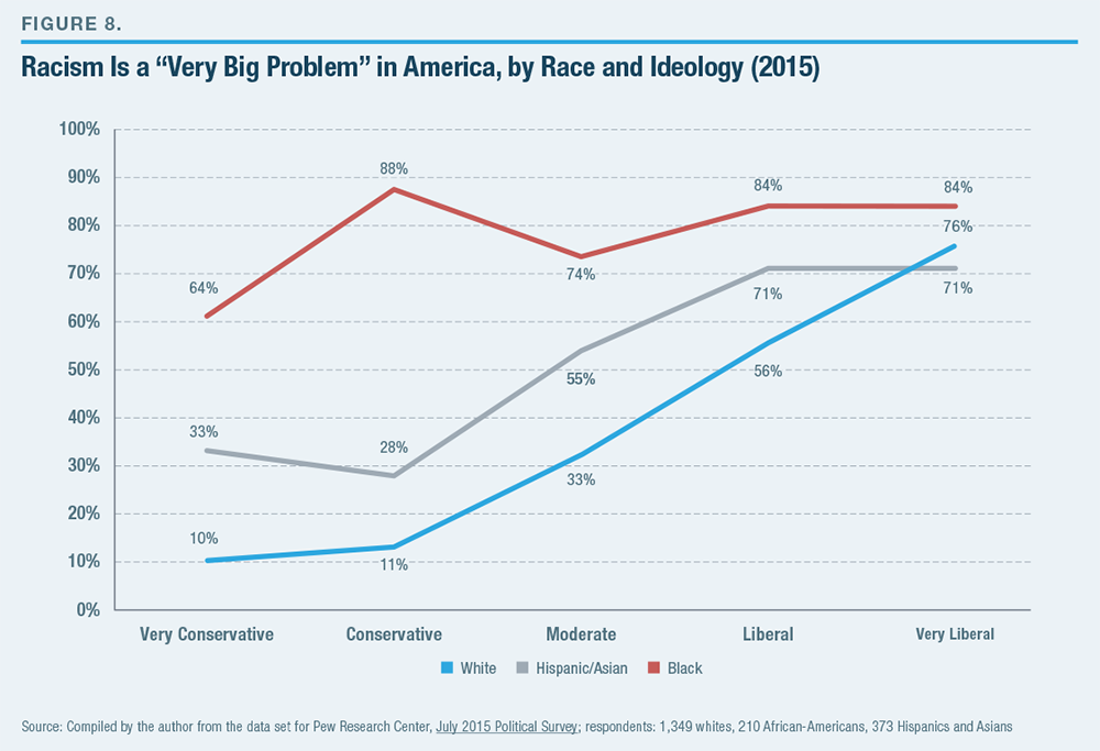 - In general, African-Americans’ opinion on race issues appears to be less affected by ideology and partisanship than white opinion. In a 2015 Pew survey, 20 points separated “very conservative” and “very liberal” African- Americans on whether racism is a very big problem. The gap between “very conservative” and “very liberal” whites was 65 points; the gap between “very conservative” and “very liberal” Hispanics and Asians was 40 points.