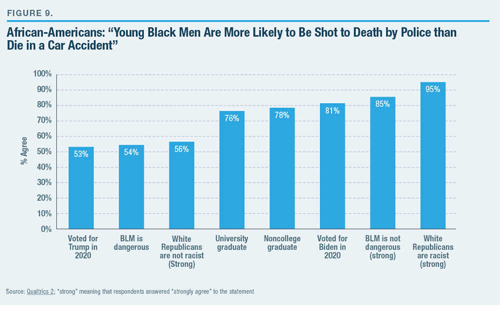 With regard to police shootings, however, political outlook did shape people’s perceptions of social reality. For example, Qualtrics 2 found that while 53% of the black Trump voters (64 individuals) believed that police shootings are the leading cause of death for young black men, 81% of black Biden voters (597 individuals) did so, a statistically significant and powerful difference (Figure 9). While education and age made no significant difference in the respondents’ answers to this question, partisan perceptions of racial attitudes played the most important role. Thus, 95% of African-Americans who “strongly agree” that “white Republicans are racist” (22% of the sample) say that police kill more young black men than cars do, while 56% of blacks who “strongly disagree” that “white Republicans are racist” say this.[31]
