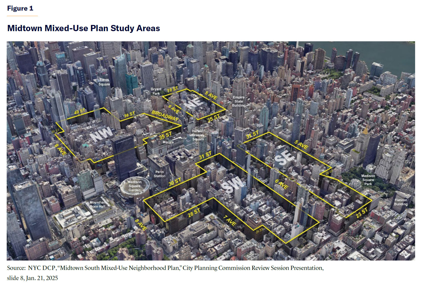 Ill-considered planning decisions, however, can impair Midtown’s dynamism and make it dull, ugly, and moribund. I was reminded of that as I reviewed the Midtown South Mixed-Use Plan recently proposed by the NYC Department of City Planning (NYC DCP).[1] The zoning changes implementing the plan began a roughly seven-month process of public review in January 2025. As a longtime, now-retired NYC DCP official, I applaud the plan’s goal of updating antiquated zoning and constructing large numbers of new housing units in Midtown. Unfortunately, the plan is seriously flawed due to contradictory policies imposed both by the city itself and by the state legislature. This brief explains in detail where the plan goes wrong and how it can be improved, as well as additional actions that the city should take to achieve its Midtown housing goals.