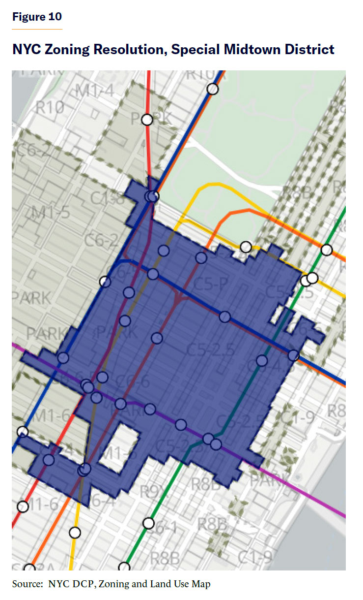 The proposed zoning has the fewest effects in the Northeast, which is small, has few residents, and is surrounded by the tall towers of the Special Midtown District. That raises the issue of why this specific plan has been proposed, rather than one that would locate NYC’s densest apartment towers in the same areas where NYC’s dense office buildings are located. In the Special Midtown District (Figure 10), residences remain capped by zoning at 12 FAR. The decision to propose this plan, and not one focused on the Special Midtown District, is a consequence of the ideology of MIH set forth originally by the de Blasio administration—that MIH had to be mandatory and could never be a choice for real estate developers. That means that if the new 15 and 18 FAR residential districts were mapped in Midtown proper, affordability requirements would have to apply to any new building, even one with less than the 12 FAR of residential floor area permitted by existing zoning. Property owners would lose the right to build very lucrative market-rate condominiums up to 12 FAR and would be very unhappy.