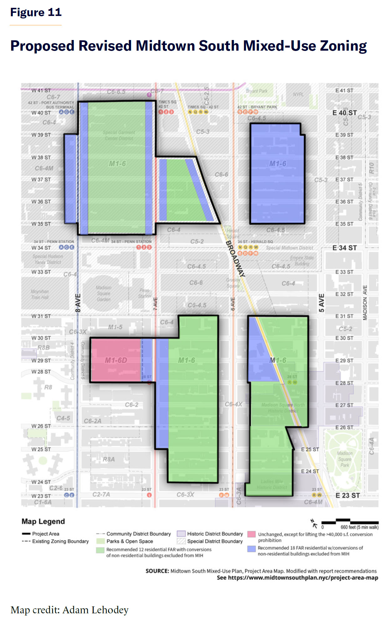 The Midtown South Mixed-Use Plan originated with a bill passed by the state legislature passed in April 2024. Between 1961 and 2024, the state Multiple Dwelling Law (MDL) capped the size of new residential buildings, even in Midtown Manhattan, at a floor area ratio (FAR) of 12.[2] The cap resulted from political bargaining, which led to the passage of the 1961 comprehensive revision to NYC’s Zoning Resolution. The city had long sought more flexibility to determine through local zoning how large residential buildings could be—the same flexibility it has for nonresidential buildings. In 2024, the legislature amended the MDL to allow new residential buildings to exceed 12 FAR, provided that such buildings comply with the provisions of the Mandatory Inclusionary Housing (MIH) program.[3] As a result, NYC DCP duly created two new zoning districts, R11 and R12, in which residential buildings could attain FARs of 15 and 18, respectively, with MIH compliance. These new districts were approved by the city council in December 2024 as part of the “City of Yes for Housing Opportunity” zoning amendment.[4] In the Midtown South Mixed-Use Plan zoning amendment, the new districts are mapped in four zones in and adjacent to Midtown Manhattan. These four areas are currently zoned for manufacturing and do not allow new housing, reflecting circa-1961 land-use conditions that have long since changed markedly.
