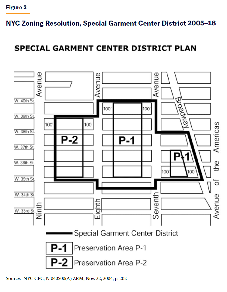 The Special Garment Center District (within the boundaries shown in Figure 2) was added to the city’s Zoning Resolution in 1987.[6] The special zoning district created “preservation” areas in the mid-blocks between Broadway and 9th Avenue, where most of the apparel manufacturing businesses were located. In these areas, manufacturing and showrooms were allowed, but new offices were not. In buildings fronting Broadway, 7th Avenue, and 8th Avenue, no new restrictions were imposed.