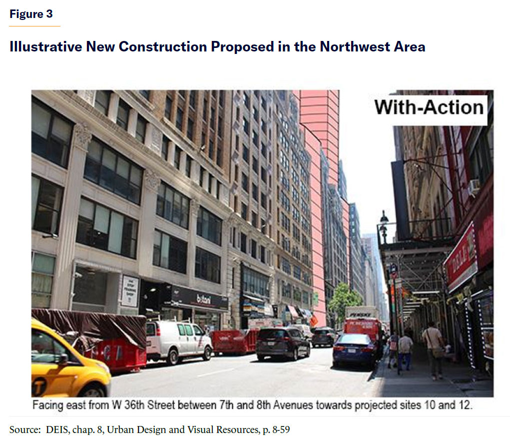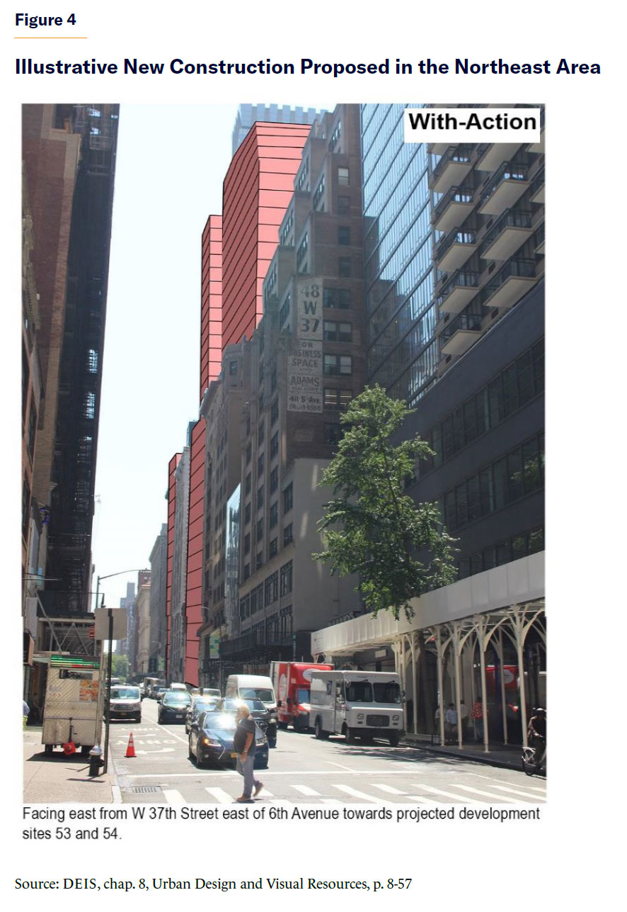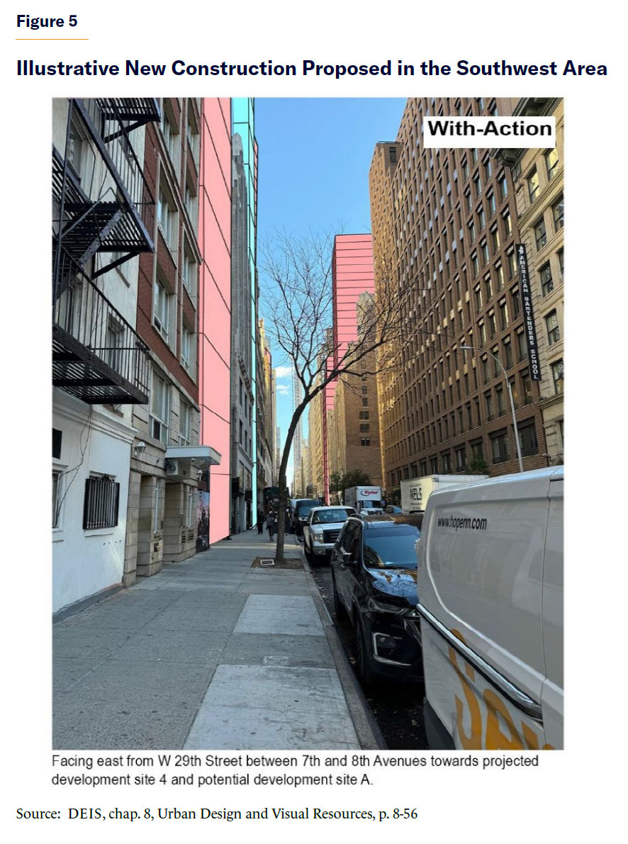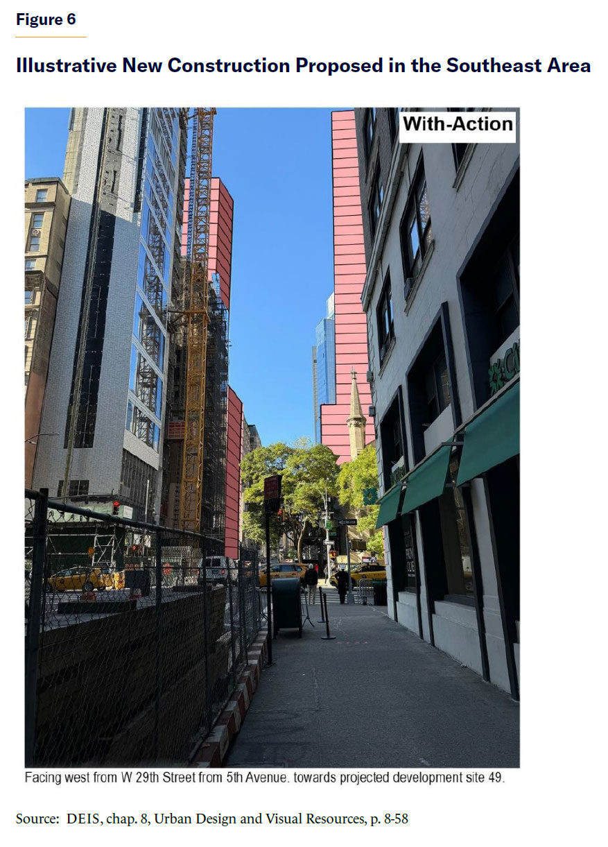 Moreover, the enormous floor area increment in the Southeast Area undermines the ability of many designated landmarks to take advantage of their recently enhanced ability to raise preservation funding by transferring their unused development rights to a nearby site.[27] The Midtown South Mixed-Use Plan DEIS acknowledges that the proposal “would result in direct (demolition, shadows, and adjacent construction) and indirect (contextual) significant adverse impact to architectural resources.”[28] No specific mitigation of these adverse impacts is proposed, with more evaluation anticipated prior to the completion of a final EIS.