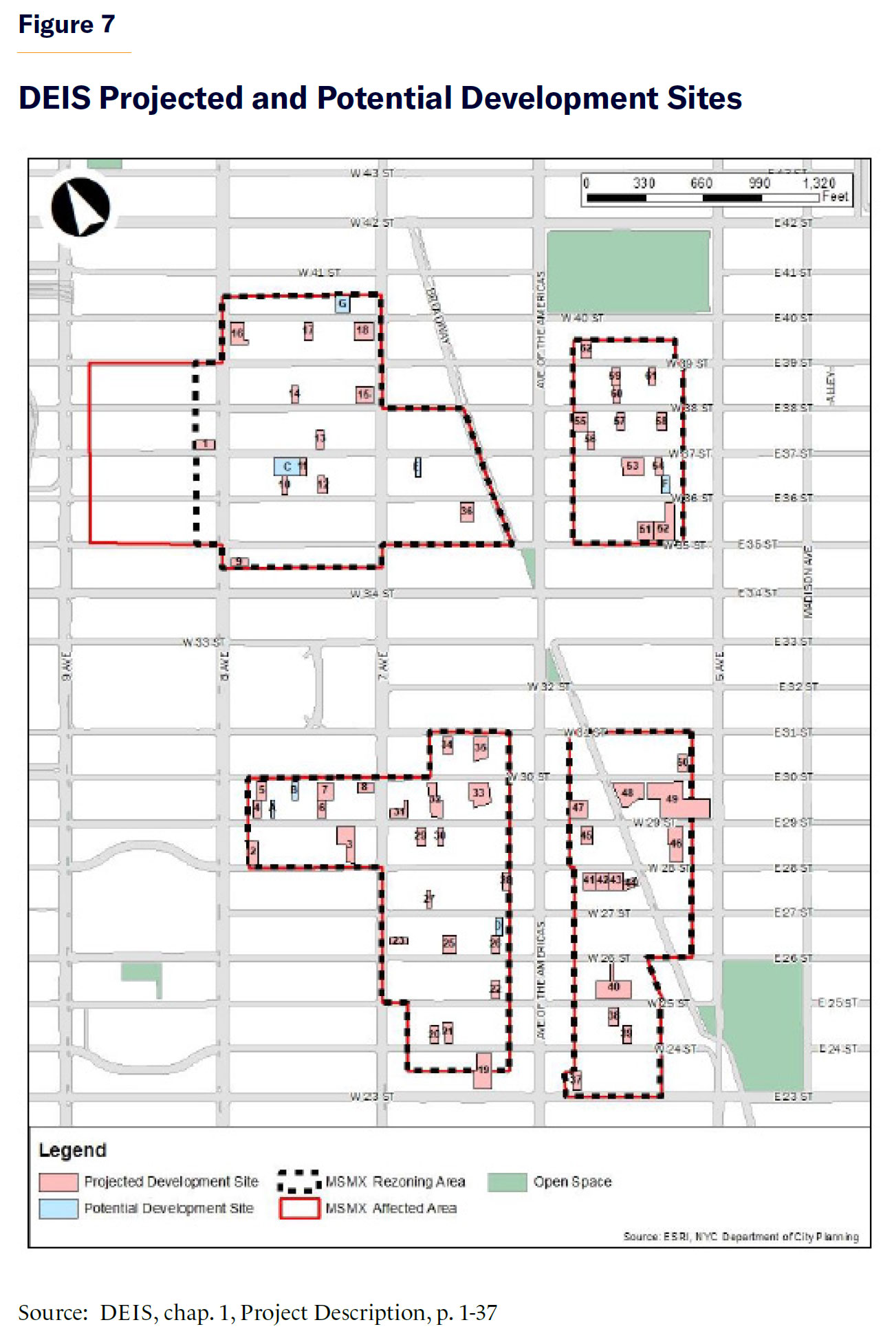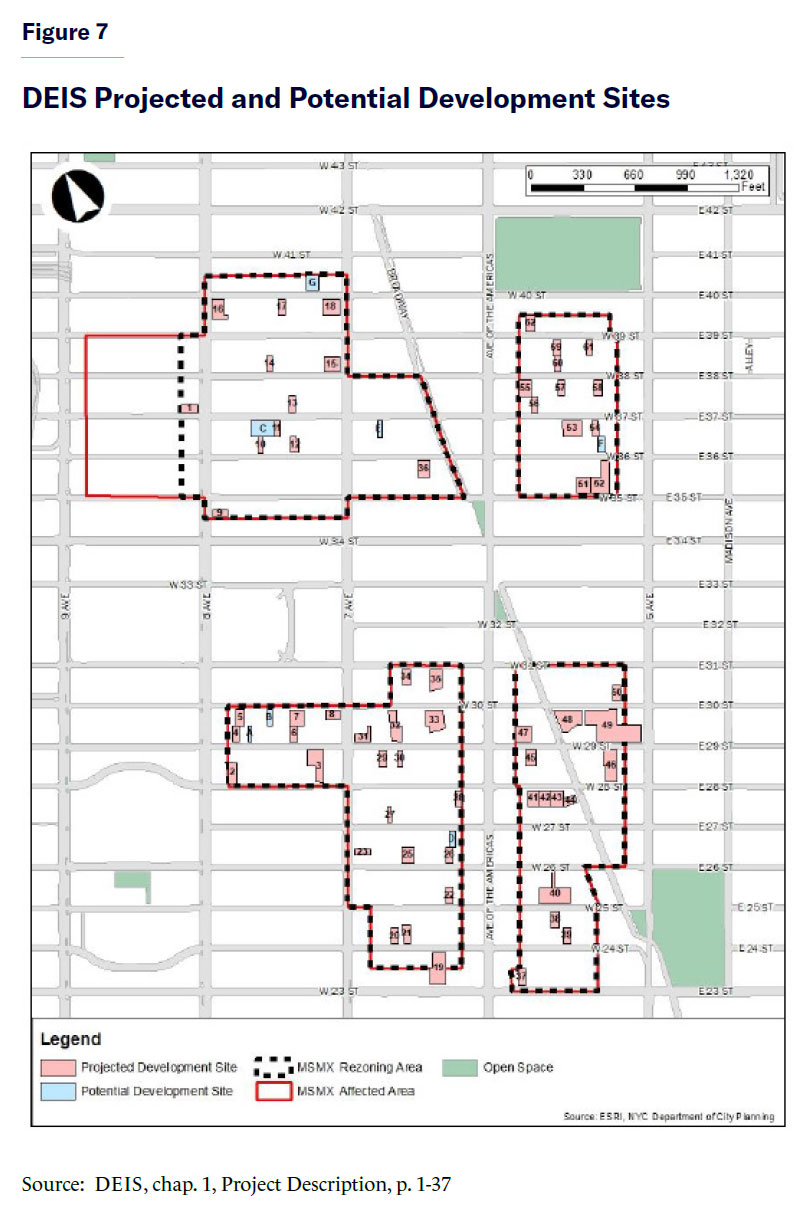 Even if the Midtown South Mixed-Use Plan were economically feasible and able to produce all the projected housing, it would not necessarily represent good land-use planning. The DEIS identifies 62 “projected” sites where new housing under the plan will be developed and 7 “potential” sites where development is less likely to occur (Figure 7). The projected sites are occupied by vacant lots, parking lots, or small buildings and therefore make attractive development sites.