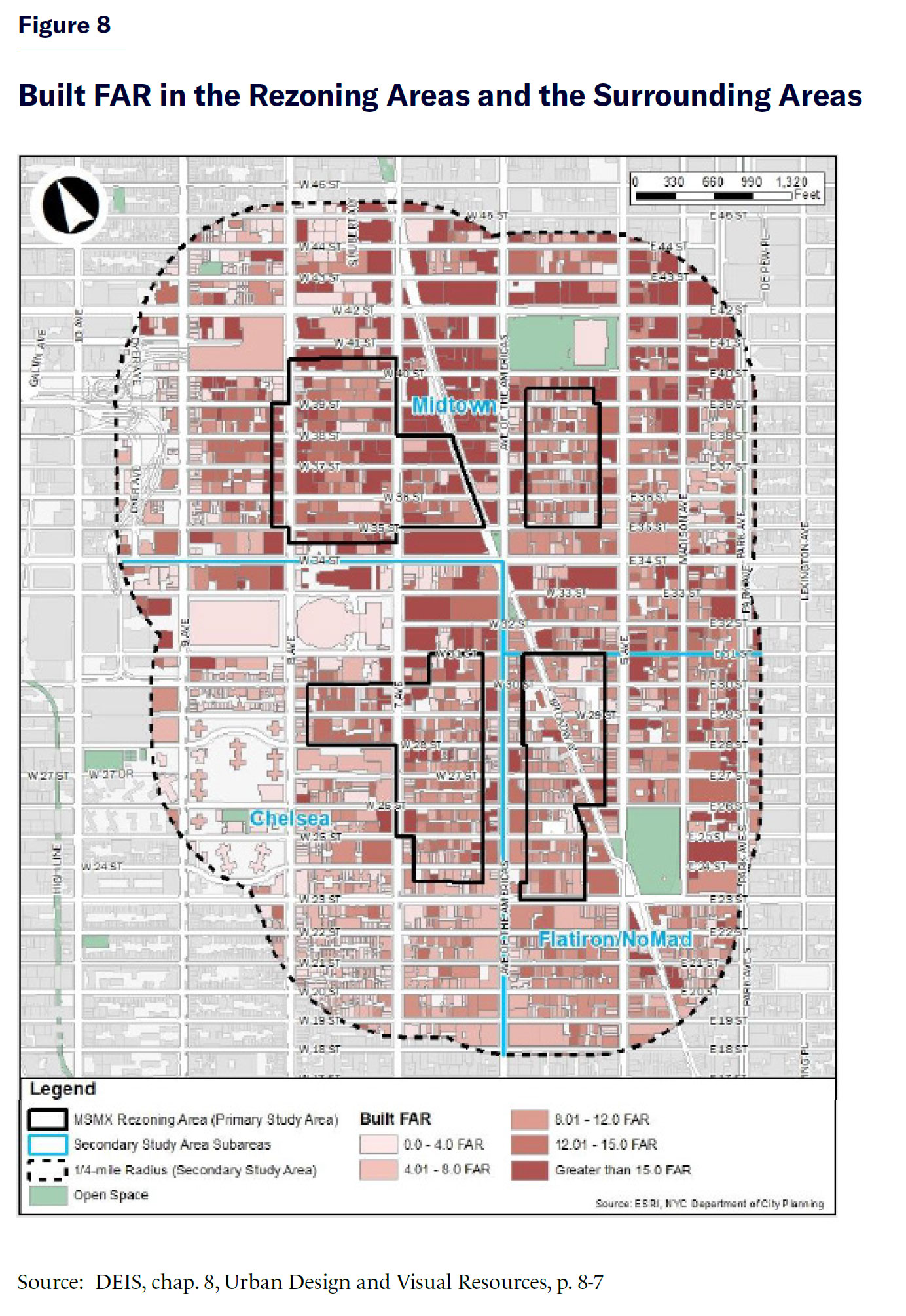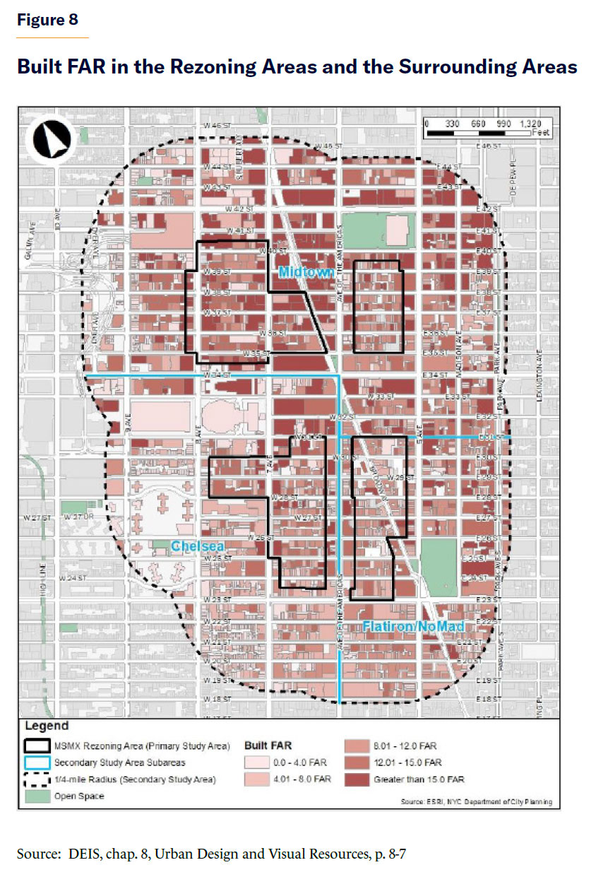 A graphic provided in the DEIS indicates that most of the lots in the rezoning areas do not exceed 12 FAR, and in many cases are well below that amount (Figure 8). The graphic indicates that buildings over 12 FAR are most likely to be found among the bulky loft buildings in the Northwest Area (Garment Center), Fur District, and along Seventh Avenue.
