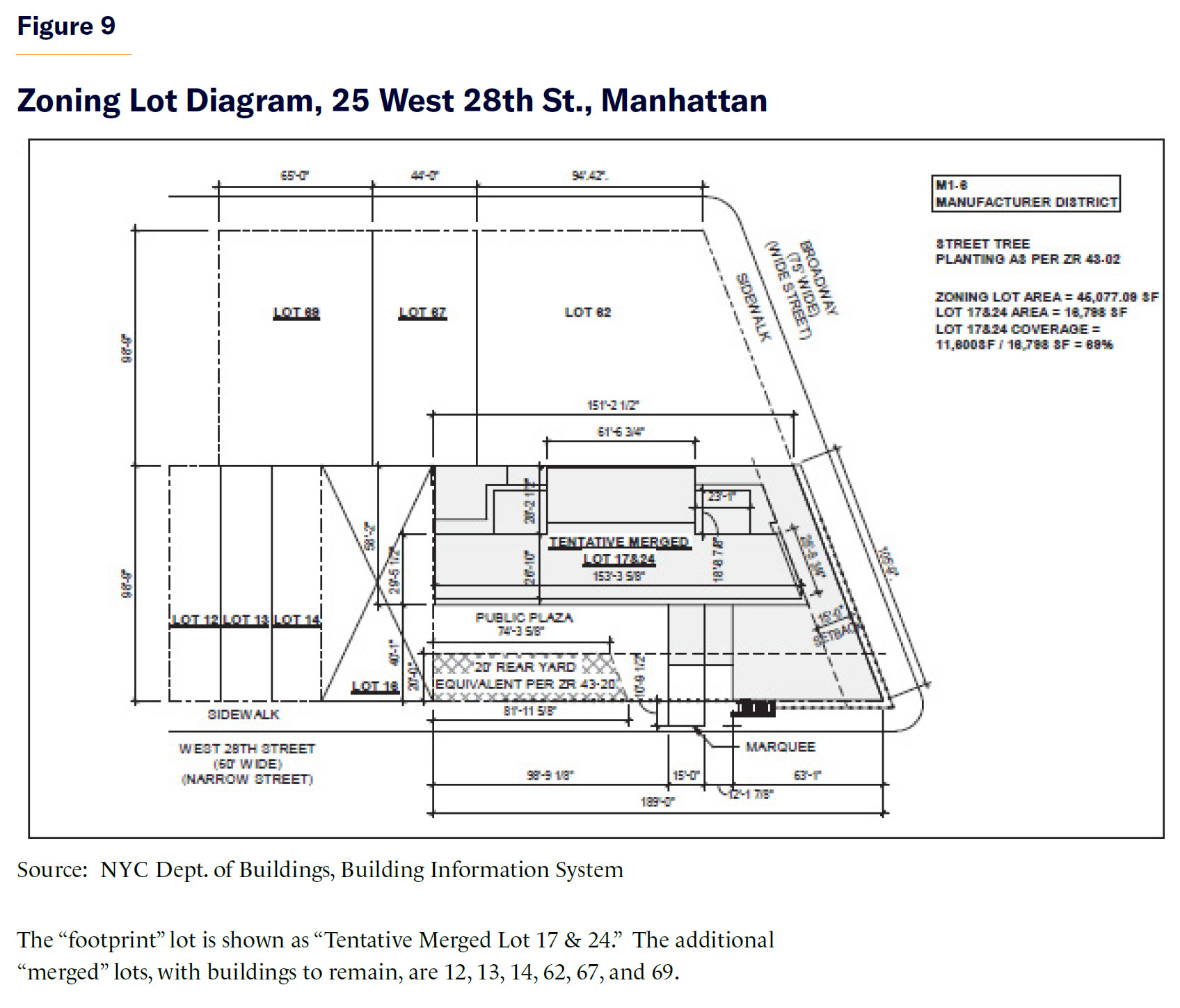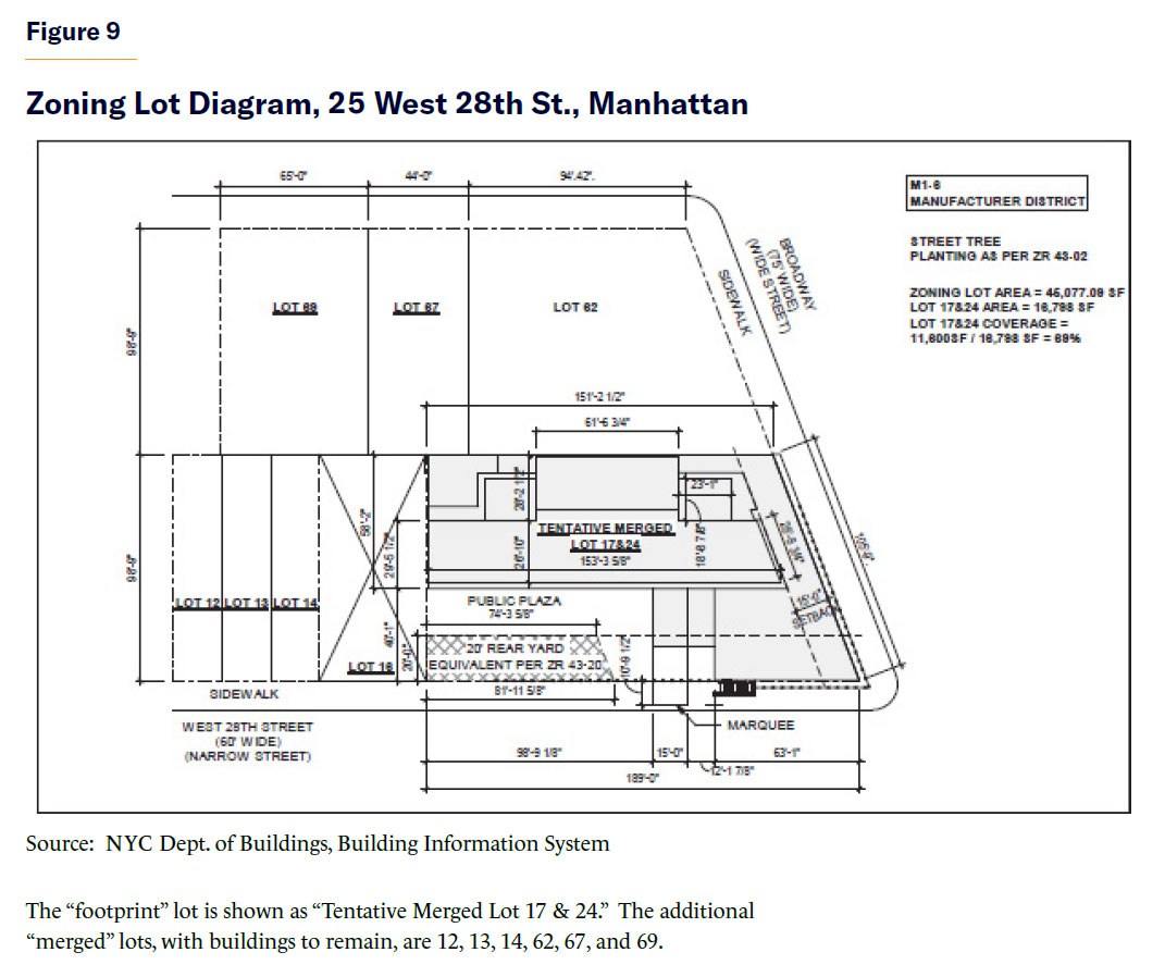 Manhattan real estate developers use zoning lot mergers all the time. For example, the 40-story hotel on the northwest corner of Broadway and West 28th St., in the Southeast Area, merges its “footprint” lot with unused floor area on six additional tax lots (Figure 9). Its FAR is 12 on the zoning lot (the maximum allowed by the existing zoning district) and nearly 14 on its “footprint” lot.