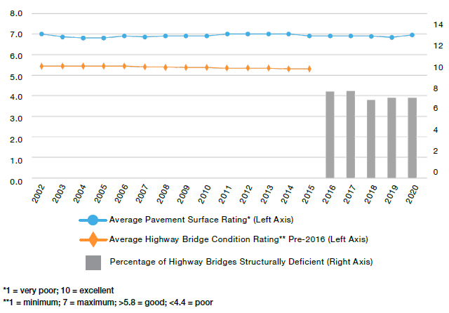 The state’s goal is to maintain pavement conditions on its 42,742 lane miles of roads between a federally recognized rating of 6.7 and 7.2 on a scale of 1 (very poor) to 10 (excellent). Though New York has indeed achieved that goal, it has not significantly improved road conditions in two decades, as shown in Figure 1. The state has also achieved its goal of keeping structurally deficient bridges below 15% of the total 7,700 highway bridges. However, it has improved bridge conditions slowly, reducing the percentage of structurally deficient bridges from just under 8% to just above 7% over a half-decade.
