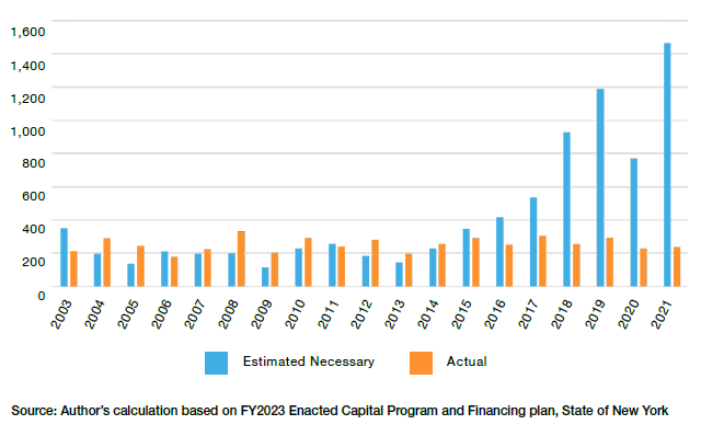 Yet since then, from fiscal years 2018 through 2020, despite a $23.4 billion, five-year transportation capital plan during that period, the state has failed to spend enough money to keep up with the estimated amount needed to maintain highways, roads, and bridges in their current state, as shown in Figures 3 and 4 on the following page. In 2019, the state DOT warned that “to achieve a state of good repair … in ten years, [the agency] would require approximately $2.5 billion per year for pavements and bridges from all levels of government, as compared to the current annual funding level for these assets of $875 million.”[6]