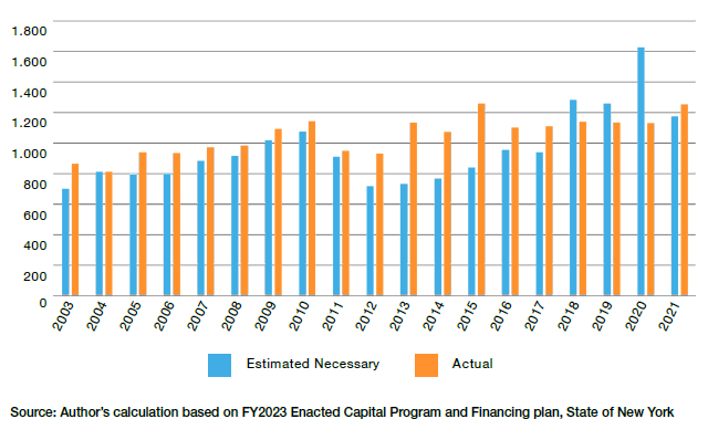 The biggest problem is an overreliance on borrowing not envisioned in the original legislation. As the state comptroller has noted, a 1993 amendment to state law allowed for borrowing against the highway and bridge trust fund’s dedicated revenues, marking “a shift in the state’s transportation capital program from being a self-funded system … to one that has become substantially debt-financed.”