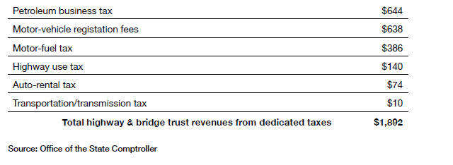 In the early 1990s, the state legislature took a similar approach to highways and bridges: enacting dedicated taxes to fund transportation infrastructure that could not pay for its capital costs through toll revenues (Table 2, below). In 1991, the state created its dedicated highway and bridge trust fund. The goal, as state comptroller Thomas P. DiNapoli puts it, was to fund “critical transportation infrastructure” on a “consistent, reliable basis.” The trust fund takes in revenues from six taxes, namely the petroleum-business tax, motor-vehicle registration fees, the motor-fuel tax (now eight cents a gallon), highway and fuel use taxes (including a mileage fee on trucks), the auto-rental tax, and transportation and transmission business taxes.[3]