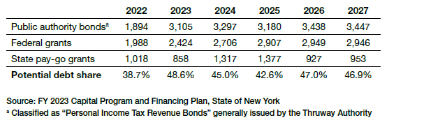 The state’s latest, $32.8 billion, five-year transportation capital plan, enacted in April 2022 as part of FY 2023 state budget,[7] relies disproportionately on borrowing (see Table 3 below). It contemplates $16.5 billion in new transportation-related debt, nearly all of it issued through public authorities and underwritten by personal income-tax collections—a form of “backdoor borrowing” designed to avoid the constitutional requirement for voter approval of general obligation debt.