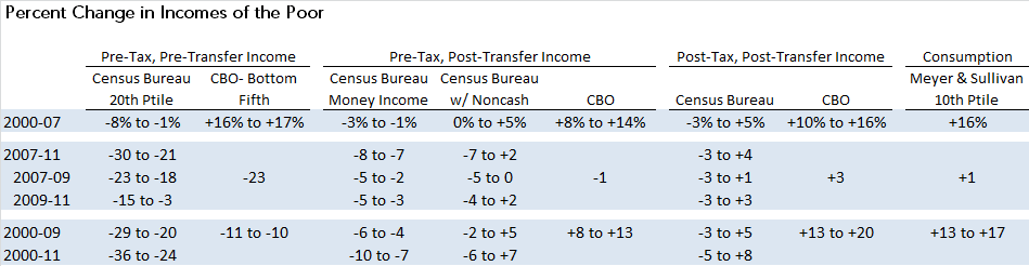 What about the poor? In the CPS, pre-tax and -transfer income at the twentieth percentile—the household poorer than 80 percent of all households—fell by 1 to 8 percent from 2000 to 2007, and the official definition of money income (which includes cash transfers) fell by 1 to 3 percent. Accounting for non-cash benefits raises the income of the poor by 5 percent at most. Factoring in changes in taxes indicates either a small drop in income or a small gain.