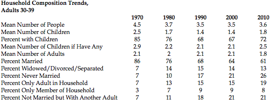 The table below shows trends in household composition for thirtysomethings in the Current Population Survey (CPS), the primary source of income estimates. Focusing on adults in their thirties prevents changes in the age distribution from influencing the trends. The table reveals the 1970s as a period of dramatic change. The number of thirtysomethings with children fell from 85 percent in 1970 to 76 percent in 1980, and the number of children among parents fell from 2.9 to 2.2. These changes reduced average household size from 4.5 to 3.7.