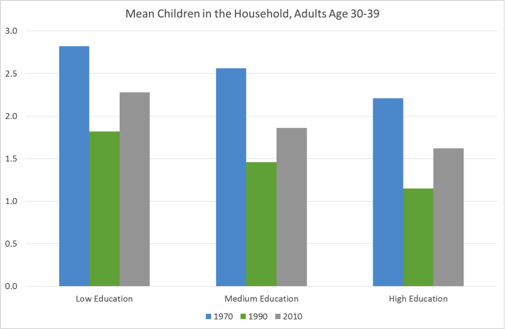 Once again, it was the number of children per household (which increased) that mattered, not the number of adults (which declined). The number of children in the average thirtysomething's household rose among the least- and most-educated thirtysomethings and among the people between them. From 1990 to 2010, the increase was from 1.82 to 2.28 for the least-educated and from 1.15 to 1.62 among the most-educated. Changes in the number of children follow the same pattern regardless of educational attainment.