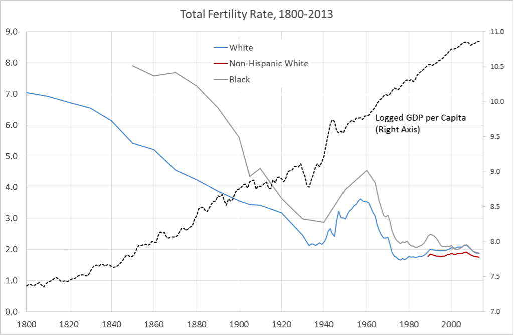 The decline in the number of children born to families did not begin in the 1970s. The following chart shows “total fertility rates” in the United States for white and black women. The total fertility rate is the number of children that would be expected to be born to the average woman if the age-specific birth rates in a given calendar year prevailed throughout a woman's lifetime as she aged. Total fertility declined steadily from around seven births per white woman in 1800 to just over two in the early 1930s. For black women, the decline was from nearly eight births in 1850 to just under three by 1940. This was a period of unambiguously rising prosperity (at least until 1929), as shown by the increase in logged GDP per capita (the dashed black line in the chart).