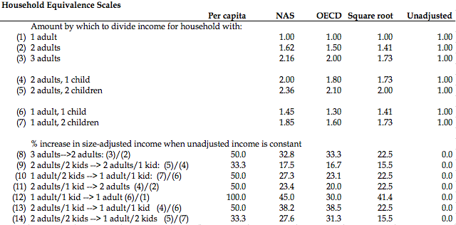 Now, moving from left to right across lines 1-7 shows the amount by which we would divide incomes to adjust them using different equivalence scales. As we move rightward across lines 2 and 3, the amount by which incomes are adjusted decreases. That means that the size-adjusted incomes will be larger moving from left to right. Line 8 shows that in our hypothetical example where households shrink from three adults to two, adjusting household income for size differences by taking the square root of household size will indicate less of an income gain than if the OECD or NAS approaches were used.