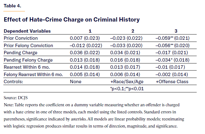 In sum: in the New York State arrest data, hate-crime offenders vary from other offenders in several ways. They are slightly older and more likely to be white. They are treated more severely by the criminal-justice system. They face a higher probability of both pretrial detention and conviction. But when it comes to criminal history and tendencies, they are remarkably similar to other offenders. That similarity persists even after statistical controls. In other words, the New York data suggest that hate-crime offenders are not “special,” or at least that they have criminal histories similar to those with more standard criminal motivations.