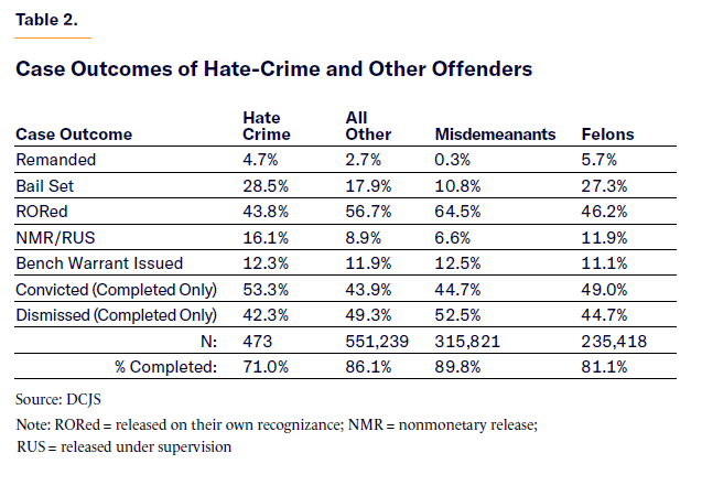 Table 2 turns from demographics to case outcomes. Again, hate-crime offenders vary from non-hate-crime offenders in several significant ways. To start, they are less likely than even felons to see their cases dismissed, with dismissals in just 42% of cases, versus nearly 45% of cases that had been resolved at the time DCJS published its data. (Hate-crime cases were also less likely to have been resolved at all.)