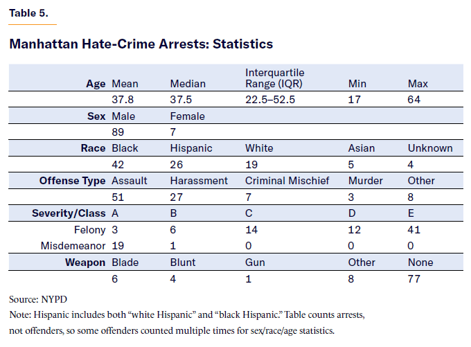 To supplement the statewide evidence presented in the previous section, this section investigates hate-crime offenders in a much smaller area: the borough of Manhattan.[26] These data are not representative but are explored here to provide a qualitative supplement to the evidence in the preceding sections.