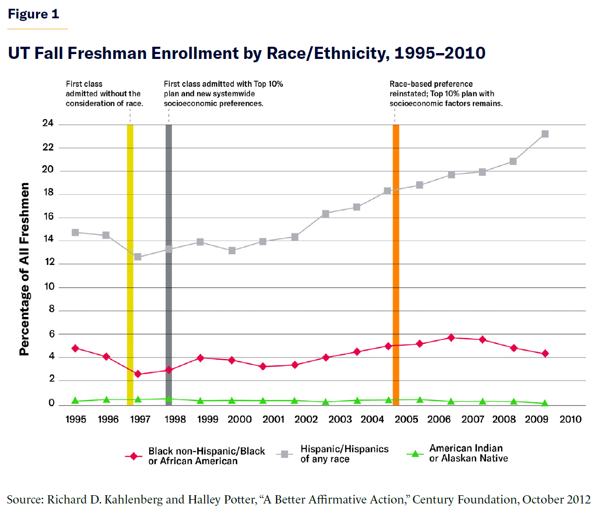 Some advocates of racial preferences criticize Kahlenberg and Potter’s findings, because the rise in diversity at UT and Texas A&M following the top 10% law “failed to keep up with even faster statewide growth in diversity,” as the report acknowledges.[37] (Put another way, it is somewhat imprecise to compare the shares of black and Hispanic freshmen at the flagships pre-Hopwood to those shares under Texas’s percent plan without accounting for demographic change in the state’s population of high school graduates.) Kahlenberg and Potter respond to this criticism by noting that “while reference to the gap between black and Latino representation at the University of Texas as compared with statewide numbers is a valid public policy concern, as a legal matter, it has never been accepted by the U.S. Supreme Court.”[38]