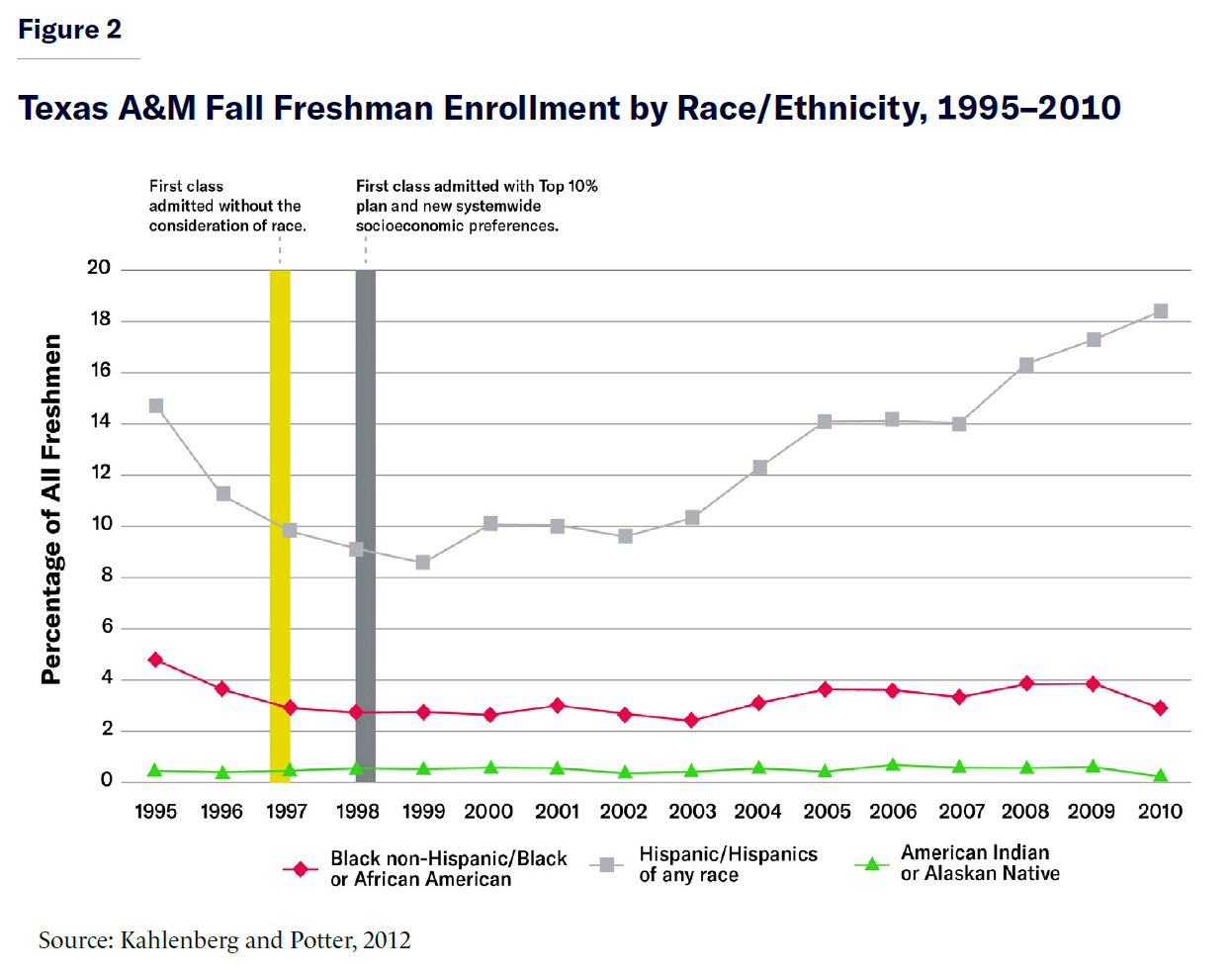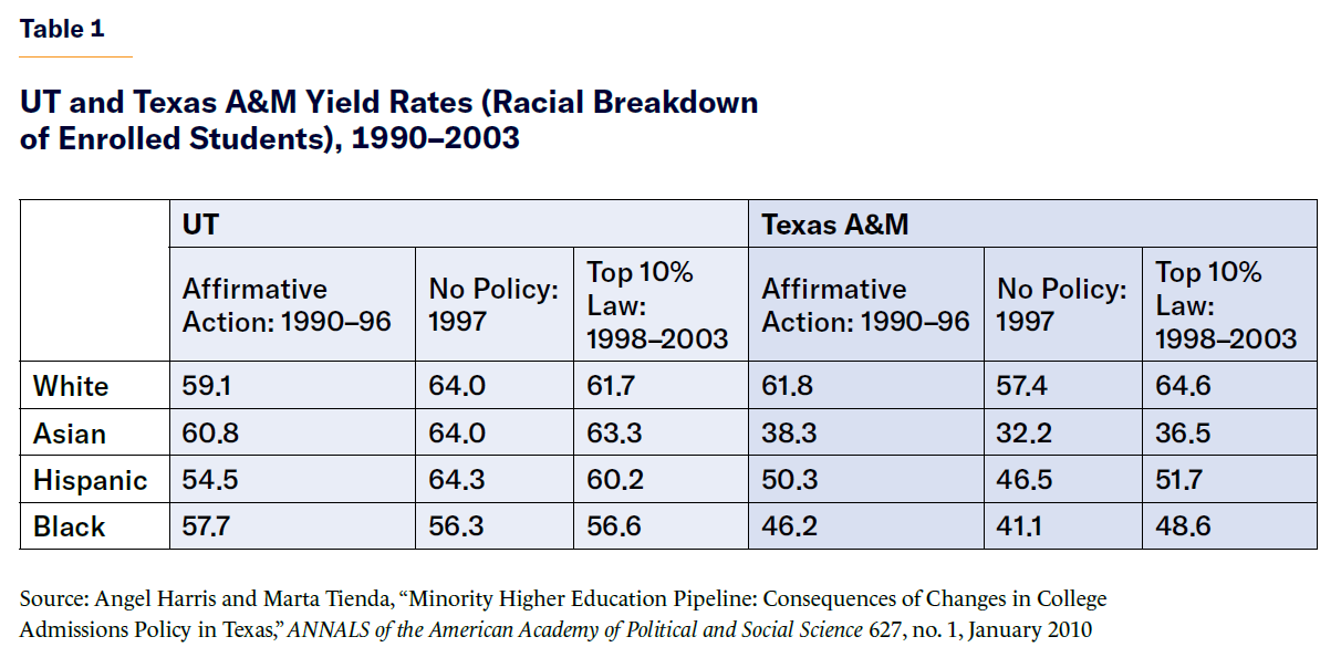 The social science research on whether Texas’s top 10% law restored black and Hispanic enrollment at the state flagships to pre-Hopwood levels is, however, less decisive. On one hand, several studies have shown that this policy does not lead to the same level of black and Hispanic representation at UT or Texas A&M as under racial preferences, particularly when accounting for demographic change in the state’s high school population.